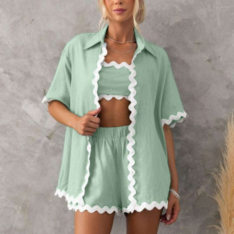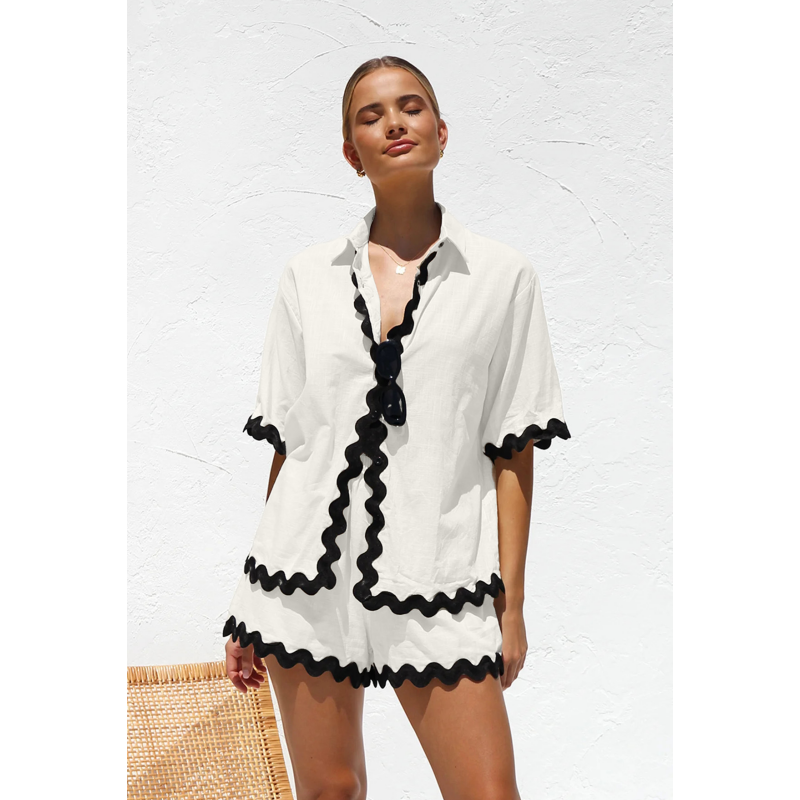 TRENDY DESIGN�- A fashionable 2-piece set featuring a shirt top and high-waisted shorts for a stylish summer look.